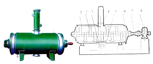 具有結(jié)構(gòu)簡(jiǎn)單,操作方便,使用周期長(zhǎng),性能穩(wěn)定可靠,蒸汽耗量小,適用性能強(qiáng),產(chǎn)品質(zhì)量好,特別適用于不耐高溫、易燃、調(diào)溫下易氧化的膏狀物料的干燥,該機(jī)經(jīng)用戶長(zhǎng)期使用證明是一良好的干燥設(shè)備。原理:被干燥物料從殼體上方正中間加入,在不斷正反轉(zhuǎn)動(dòng)的耙齒的攪拌下,物料軸向來(lái)回走動(dòng),與殼體內(nèi)壁接觸的表面不斷更新,受到蒸汽的間接加熱,耙齒的均勻攪拌,粉碎棒的粉碎,使物料表面水分更有利的排出,氣化的水分經(jīng)干式除塵器、濕式除塵器、冷凝器,從真空泵出口處放空。結(jié)構(gòu):真空耙式干燥機(jī)的主要部件 |